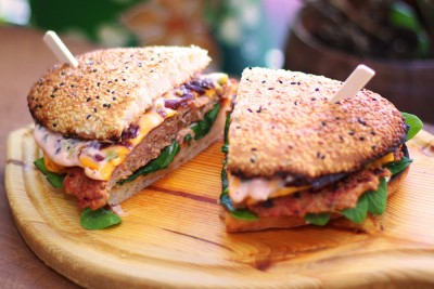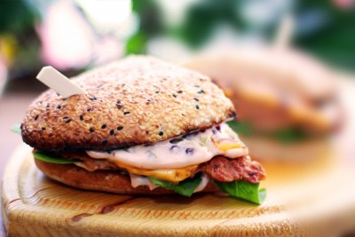 piept de pui 29%, CHIFLA (FAINA DE GRAU, apă, SEMINTE DE SUSAN (5%), ulei de rapiță, aluat (SECARĂ), făină de GRAU pregelatinizata, drojdie, sare iodată, negrilica (0,3%) produs decongelat), ceapa caramelizata (ceapa 95%, zahar, brandy Alexandrion (apa demineralizata, alcool etilic de origine agricola, distilat din vin, sirop de zahar invertit, colorant: caramel simplu, arome), sare), SOS DE MAIONEZA (ulei rafinat de rapita (53%), apa (30%), zahar, otet, MUSTAR (apa, otet, BOABE DE MUSTAR, zahar, sare), amidonuri modificate, sare, acidifiant (acid lactic), praf de OU integral (0,3%), agent de îngrosare (guma de xantan), conservanti (sorbat de potasiu, benzoat de sodiu), colorant (beta-caroten), antioxidant (calciu-disodic-EDTA)), PESMET( PAINE alba uscata si macinata obtinuta din FAINA ALBA DE GRAU, drojdie, sare), ulei vegetal ( ulei de palmier 100% dublu rafinat nehidrogenat), BRANZA TOPITA CU CHEDAR (BRANZA CHEDAR 50%, LAPTE DEGRESAT reconstituit, LAPTE PRAF degresat, UNT, saruri de topire polifosfati si citrat de sodiu, sare, corector de aciditate fosfat de sodiu, coloranti: caroteni si extract de ardei rosu, aroma naturala), castraveti in otet (apa, otet din alcool, sare, conservanti benzoat de sodiu, extracte de condimente,indulcitor zaharinat de sodiu), ketchup dulce (piure de rosii (63%,) zahar, apa, otet din alcool, amidon modificat din porumb, sare, acidifiant (acid citric), condimente, conservanti (benzoat de sodiu, sorbat de potasiu), aroma de tomate), salata verde, piper60 RON / gr